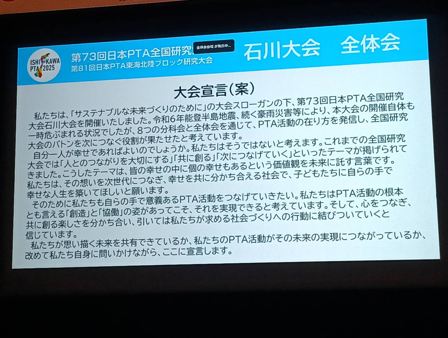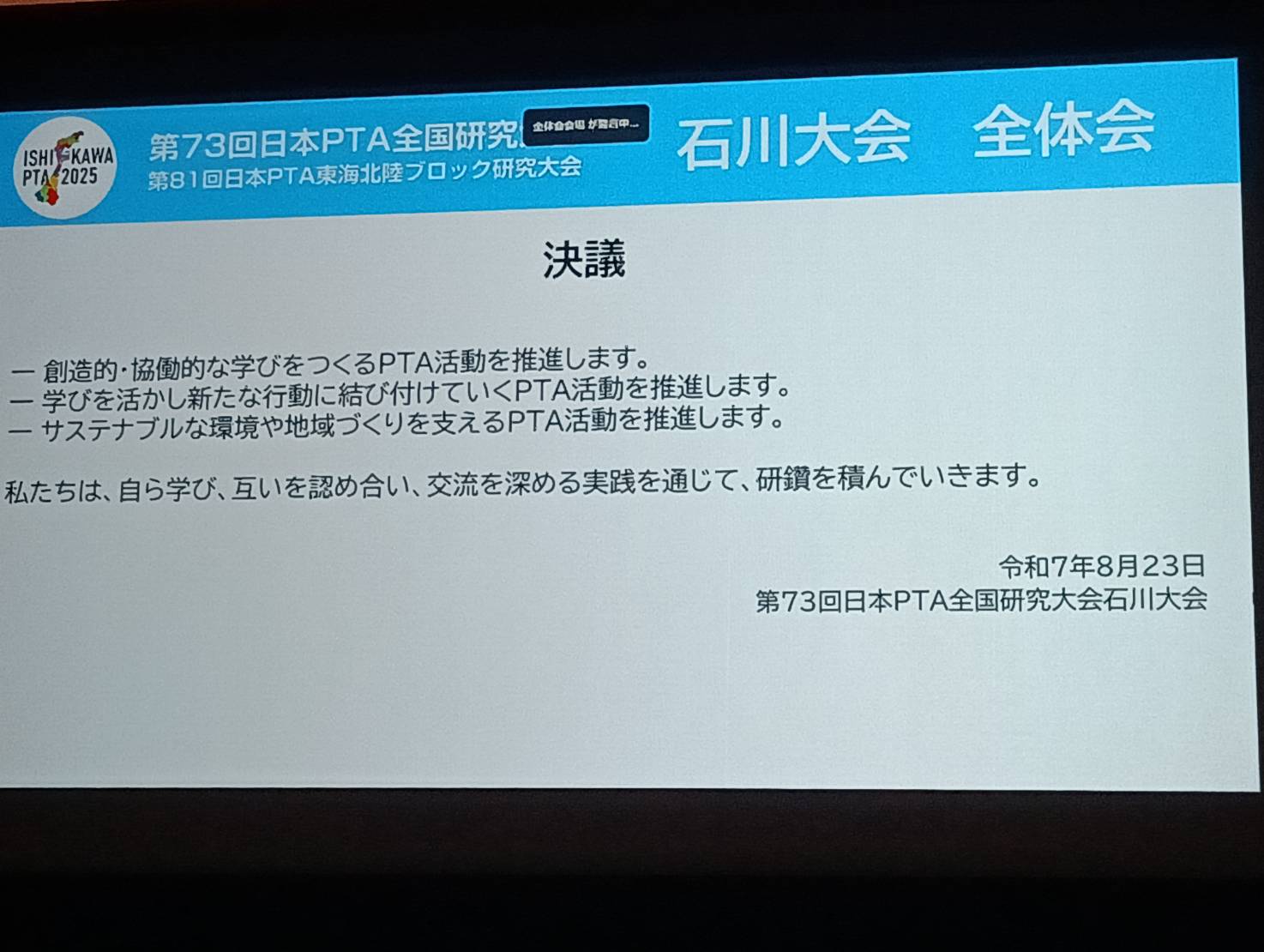 「日P連」全国研究大会・東海北陸研究大会 2026年2月6日 / master 令和7年度 「日P連」第73回全国研究大会・第81回東海北陸研究大会 開催されました。 日時:令和7年8月22・23日(金・土) 場所:石川県内8会場 斉藤会長、小玉子育て委員長、堀県P委員が参加いたしました。
